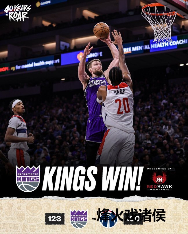 小萨16投12中高效砍下29分18篮板4助攻率队取胜,德罗赞24分6篮板,蒙克23分4助攻,国王两连胜西部第九。