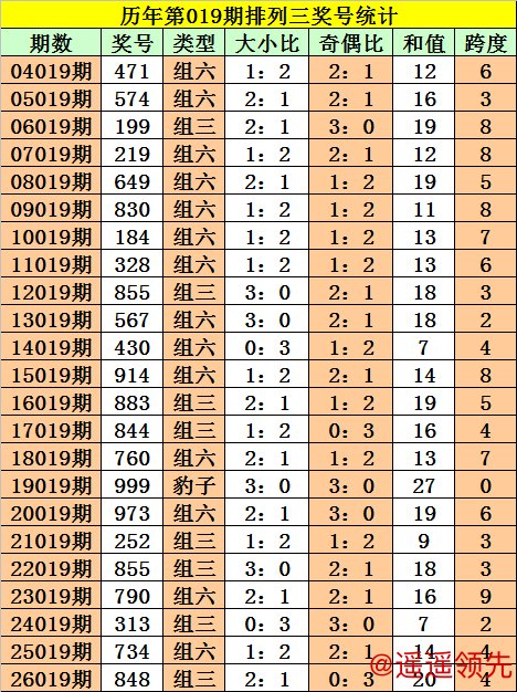 排列三第2026019期奖号:848,和值20,跨度4,大小比2:1,奇偶比0:3。